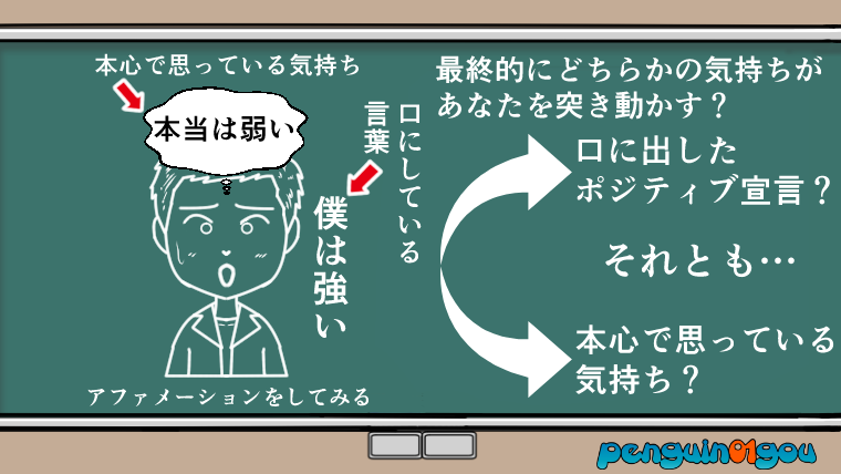 もし、自分は強くないと感じながら、「私は強い」と口にしたとして、最終的にどちらの気持ちがあなたを突き動かすだろうか?