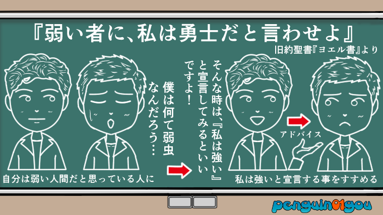 旧約聖書『ヨエル書』の「弱い者に、私は勇士だと言わせよ」というくだりと同じだと思うのです。