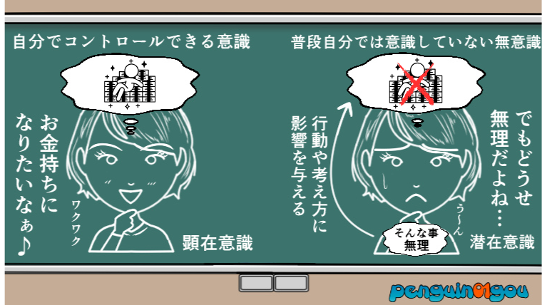 う〜ん、なるほど。人間の意識には自分でコントロールできる「顕在意識」と、自分でも気づかないうちに行動や考え方に影響を与える「潜在意識」の二つがあるんですね。