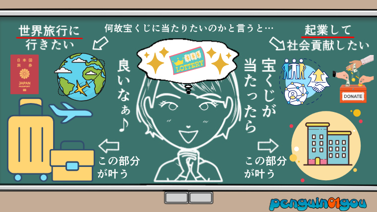 - お金が欲しいから宝くじに当たって欲しい。なぜなら…「世界一周旅行をしたい」から