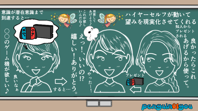 「潜在意識」は、高次の自分とも呼べるハイヤーセルフと繋がっていて、そして、僕たちの意識が「潜在意識」にまで到達すると、このハイヤーセルフと呼ばれる存在が動き、僕たちの願いを現実化させてくれるそうです。