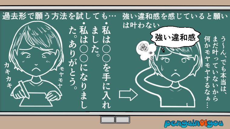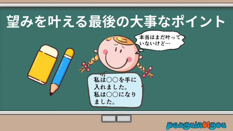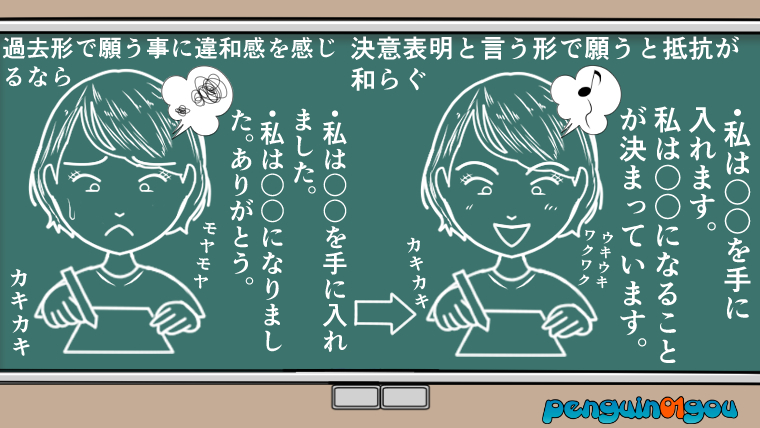 でも著者も語っている通り、、実際にはまだ叶っていないのにも関わらず、「願いがかないました」と言う場合、違和感を感じてしまう人もいるのではないでしょうか?