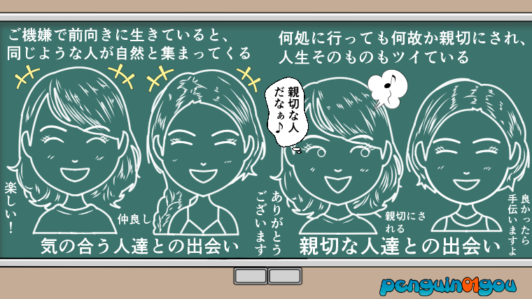 実際、あなたもこれまでの人生で体験したことがあるはずです。ゴキゲンで前向きに生きていた時は、周りには同じようにはつらつとした明るい人が集まってきて、どこに行ってもなぜか親切にされ、人生そのものもツイてることが多かったはずです。