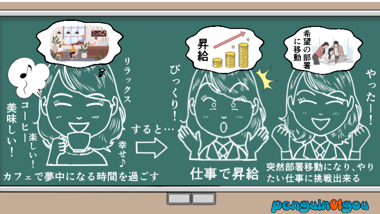 ところがしょっちゅうカフェで夢中になれる時間を過ごしていると、今やっている仕事で、突然昇給したり、以前からやりたいと思っていたセクションに異動できたりするのです。