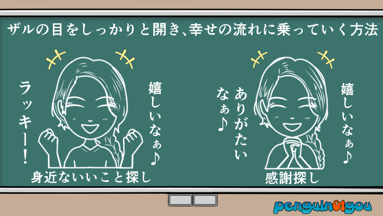 う〜ん、なるほど。幸せを引き寄せるには、まず「自分自身が幸せになる」ことが大切であり、そのためには身近にある「いいこと探し」感謝探し」をすることが一番簡単な方法なんですね。