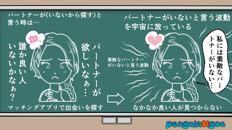 もちろん、中には「パートナーが見つかる」ということに確信を持っていて、楽しんでパートナー探しをしている人もいるでしょう。その場合はいいのですが、不安や不足感から探す場合は、あなたにとっていい現実は引き寄せません。