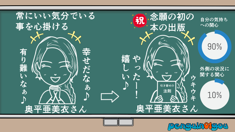 さらに半年後には念願だった初の著書『「引き寄せ」の教科書』(アルマット)を出版できました。この本が出版された頃には、外側の状況への関心は10%、自分の気持ちへの関心が90%以上になっていたと思います。