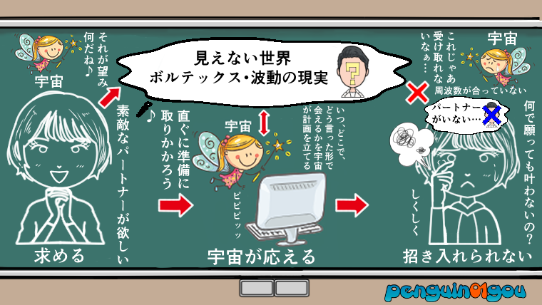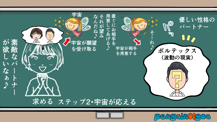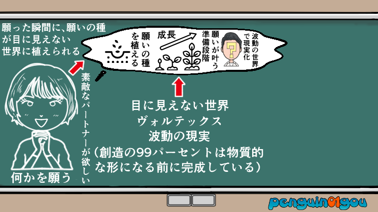 ただこの段階では、まだ実際に目に見える形としては「優しい素敵なパートナー」は現れません。あくまでもボルテックスと呼ばれる(波動の現実)として叶っている状態です。