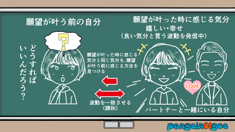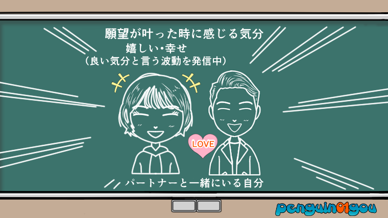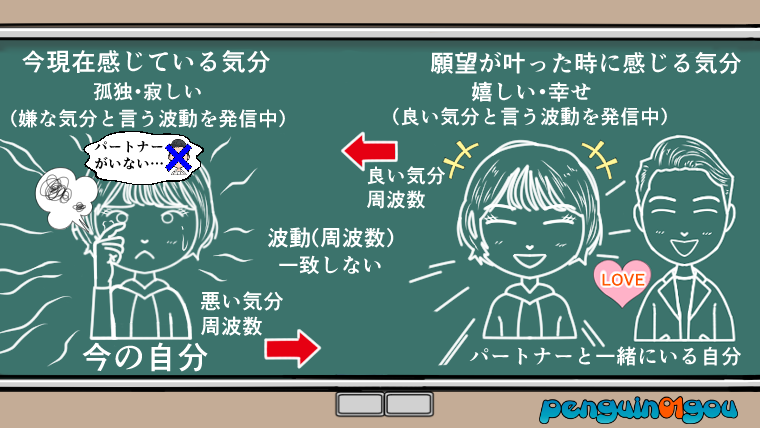例えば、願望が叶った時に感じる気分が嬉しいとか幸せといった「良い気分」だとして、今現在感じている気分が、「パートナーがいない」と言う孤独や寂しいといった「悪い気分」だったとします。