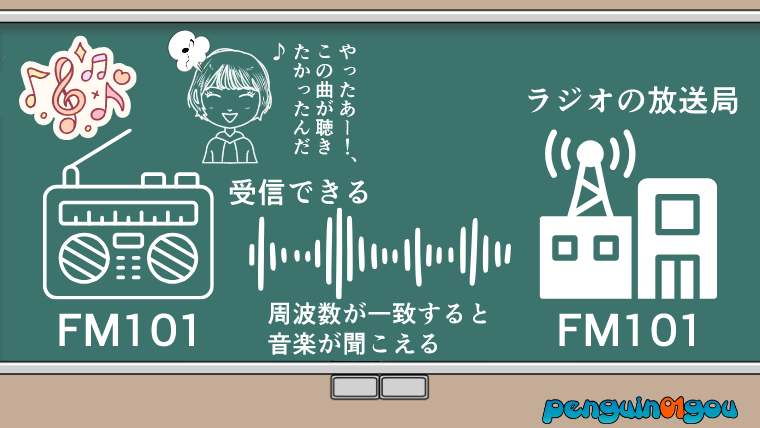 例えばみなさんが、あるラジオ放送局のラジオ放送の番組内で、自分の聴きたい音楽番組が放送されていたとします。そのラジオ放送局の周波数はFM101だとします。