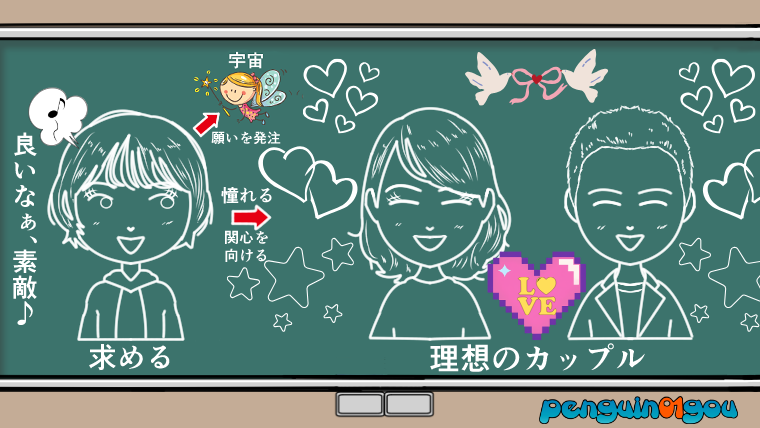 他にも、例えば街中を歩いている時などに、素敵なカップルを見かけて、そのカップルに対して「憧れ」や「関心」を向けているだけでも、自然と「求める」という行為は行われています。(下記イラスト参照↓)