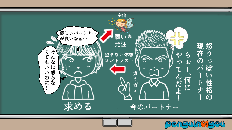 こう言った「望まない人」や「望まない出来事」などを経験することで、無意識のうちに「優しいパートナー欲しい」と言う「求める」という行為が自然と行われていたりもします。(下記イラスト参照↓)