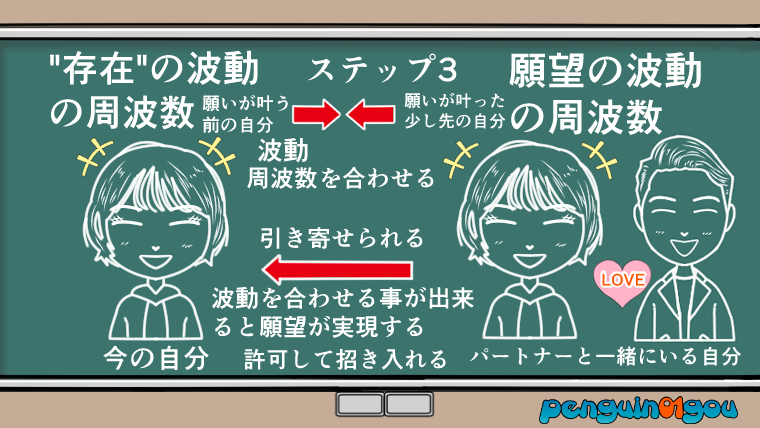 第三段階の(ステップ3・許可して招き入れる)とは、自分の“存在”の波動、分かりやすく言うと、今現在自分が発している波動と願望が持って(放って)いる波動との「波動(周波数)を合わせる」必要がある段階です。(下記イラスト参照↓)