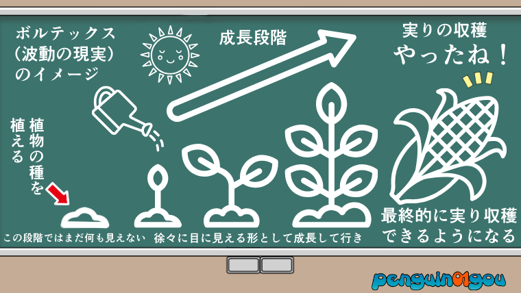 例えば植物の種を土に植えたとしても、種が土の中にある段階では何も見えませんよね?。でも日にちが経ち、徐々に土の中から目を出して段々と成長して行くと、いずれは花が咲いたり実りを収穫できる日が訪れます。(下記イラスト参照↓)