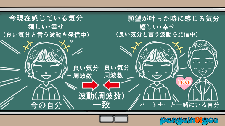 すると、「願望が叶ったときに感じるいい気分」と「今現在感じているいい気分」とは同じなので、この時、波動(周波数)が一致していると言うことになります。(下記イラスト参照↓)