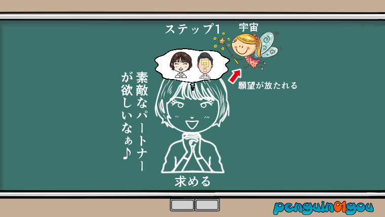 例えば、もし「素敵なパートナー」を求めていると言う場合は、「素敵なパートナー」に対して意識(関心)を向けているだけで、自然と(求める)というステップは完了しています。(下記イラスト参照↓)