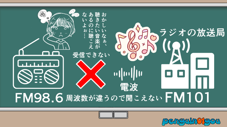そして当然の事ですが、もし周波数が違えば放送が受信ができず、ラジオから聴きたい音楽番組の放送を受信して聴くことはできません。(下記イラスト参照↓)