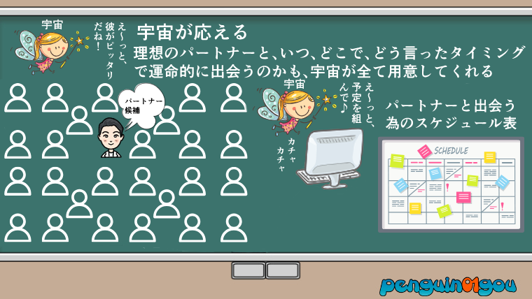 その理想のパートナーと、「いつ」「どこで」、「どう言ったタイミングで運命的に出会うのか」と言ったことも、全部宇宙がスケジュールを組んでくれると言うことです。(下記イラスト参照↓)