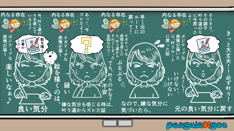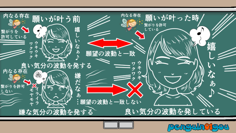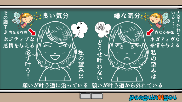 つまり、「気分を良くしてくれる感情」を感じている時は、願いが叶うルートを歩んでいて、逆に「気分を悪くする感情」を感じている時というのは、願いが叶わないルートを歩んでいる、ということになります。