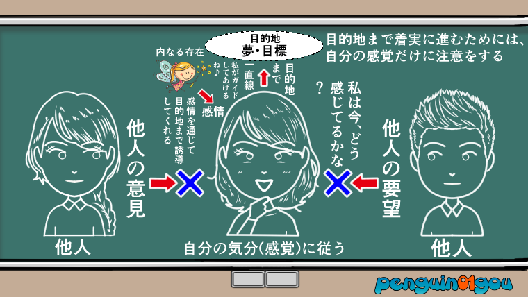 う〜ん、なるほど。外からの影響に従っていると、今いる場所から行きたい場所(夢や目標)に向かって道をそれずに進んでいくことはとても難しいことなので、だからこそエイブラハムは、行きたい場所(夢や目標)に着実に進むためには、自分の「内なる存在」からもたらされる、感覚(感情)に注意する必要があると語っているんですね。