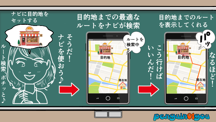 そんな時に役に立つのが、グーグルマップなどの地図(ルート)検索アプリです。これを使えば、今いる現在地と、行きたい目的地を設定すれば、あとは自動的に目的地までの最適なルートをナビが教えてくれます。