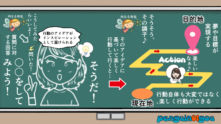 う〜ん、なるほど。「内なる存在」は感情を誘導システムとして使い、今いる場所から行きたい場所(夢や目標が叶うところ)まで、僕たちを導いてくれる、ということなんですね。