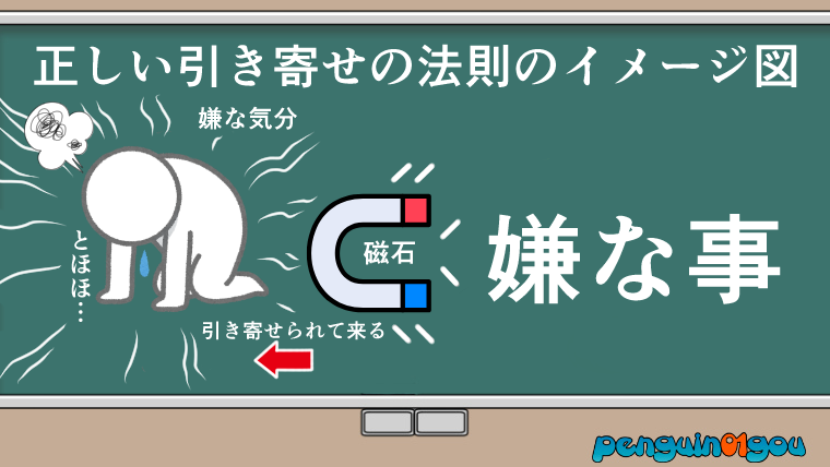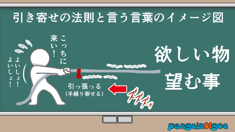 引き寄せの法則とは、自らの欲しいものや望む事を、自らの元に引っ張ってくる(手繰り寄せてくる)法則であると…。(下記イラスト参照↓)