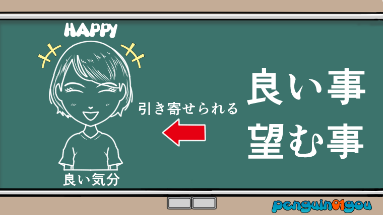 その理由はとてもシンプルで、『良い気分でいると、良い事が引き寄せられてくる』からです。(下記イラスト参照↓)