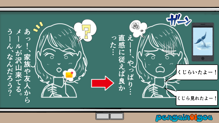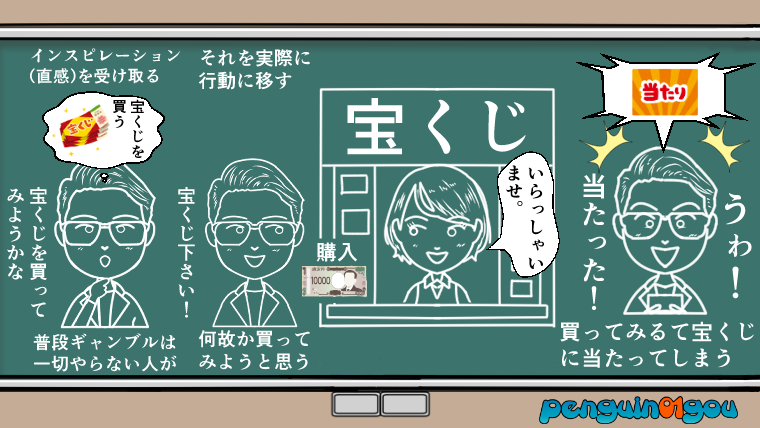 他にも、普段ギャンブルなんて一切やらないような人が、ふと『宝くじを買ってみる』とインスピレーション(直感)を受け取り、そのインスピレーション(直感)に従って実際に宝くじを買ってみると、本当に宝くじが当たってしまう。こう言った話も実際にあります。(下記イラスト参照↓)
