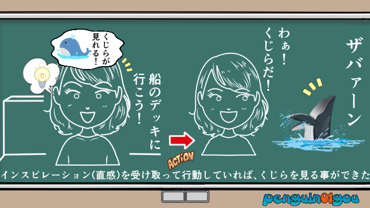 エスターの場合だったら、『いま船のデッキに行けば確実にくじらが見れる』というグットタイミングで、『船のデッキに行く!』っというインスピレーション(直感)を与えてくれたと言う事です。