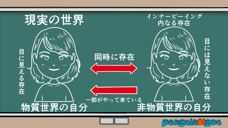 このインナービーイング(内なる存在)とは、目には見えない非物質世界にいる肉体を持たないもう一人の自分自身のことを言います。イラストでイメージするとこんな感じになります(下記イラスト参照↓)