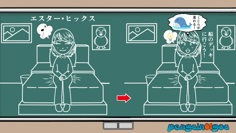 なぜエスターが船のデッキに行こうと思い立ったのかと言うと、それは『いま船のデッキに行けばくじらが絶対に見れる』っと思ったからだそうです。(下記イラスト参照↓)