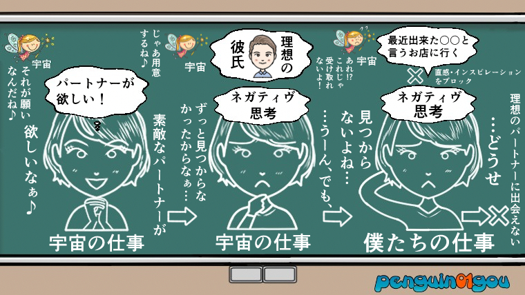 願いを放った後に、その願いに逆行する「ネガティブ思考」が頭の中にあると、その「ネガティブ思考」がブロックになり、宇宙から与えられる直感・インスピレーションが受け取れなくなってしまうそうです。