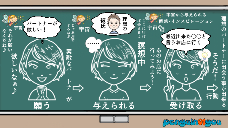 望みを叶えるには、宇宙が与えてくれる直感(インスピレーション)を受け取り、その直感(インスピレーション)に基づき行動すると、望みが叶ったり欲しいものが手に入ったりします。(状況によっては特に行動せずとも、願いが叶ったり手に入ったりする事もあります)