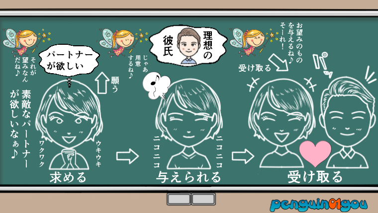 引き寄せの法則ではこの3つのステップを踏む事により、願いを自然と叶えていくことができるそうです。(願いが叶うプロセスについてより詳しく知りたい方は、こちらの記事をご覧になってみてください。まったりしながら引き寄せる(SB Creative))