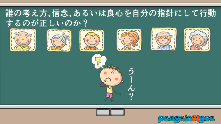 それでは、あなたはどの考え方、信念、良心に従って善悪を判断すべきなのだろうか?すると、こう自問する事になりはしないか?「誰の考え方、信念、あるいは良心を自分の指針にして行動するのが正しいのだろう?」