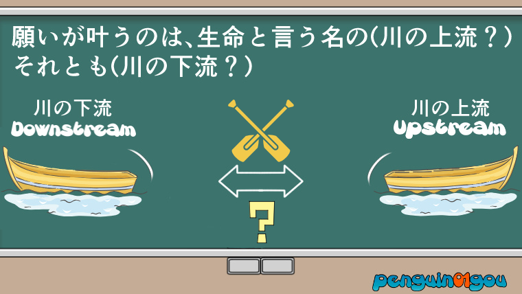 この時僕たちは、川の(上流)と(下流)、一体どちらに向かうと願いが自然と叶うようになっていると思いますか?。多分多くの人はこんな質問をされたら、川の上流に向かう事こそが、願いが叶う当然の道だと信じていると思います。