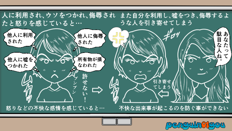 人が自分を利用し、ウソをつき、侮辱し、所有物を損なっていると怒りを感じていれば、どんな行動をとっても、そのような不快な事が起こるのを防ぐ事は出来ない。それは「引き寄せの法則」に反する。