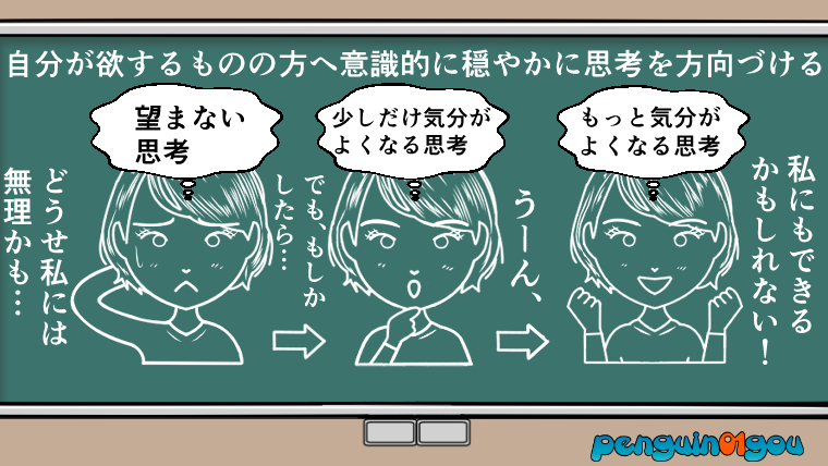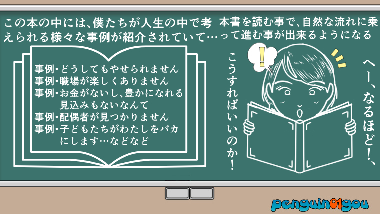 ここから先のお話では、自分の思考を穏やかに望む方向へ向けていくための具体的な方法について、仕事や人間関係、お金や健康などなど、さまざまな事例を使って分かりやすく紹介されています。