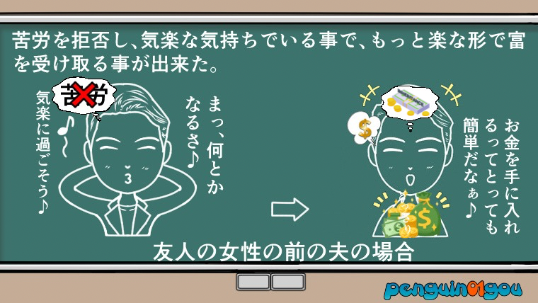 一方は、社会が教えたように一生懸命働いて、苦労しても望むことは得られず、もう一方は、苦労することを拒否し、気楽な気持ちでいることで、もっと楽な形で富を受け取りました』。