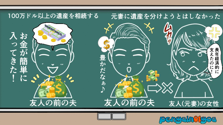 相談者の女性の話によると、彼(前の夫)は今までに、お金が大切だと思うような様子は一切なかったのにも関わらず、実は最近、彼(前の夫)が100万ドル(日本円で1億3000万円)以上の遺産を相続したことが分かったそうです。