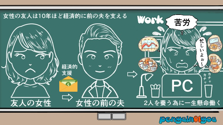 その質問者の女性には女性の友人がいて、その友人の女性は以前結婚をしていて、離婚するまでの約10年近く、前の夫を経済的に支えていたそうです。