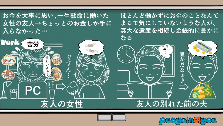 お金を大事に思い、一生懸命に働いた質問者の友人の女性(元妻)は、金銭的に報われず。逆にほとんど働きもせず、お金の事なんてまるで気にじていなかった友人の前の夫は、莫大な遺産を受け取って豊かになってしまう