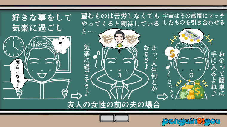 その夫は気楽にして、罪悪感を抱こうとせず、望むものは苦労せずともやってくると期待していたので、宇宙はそうした感情にぴったり合ったものを正確に引き合わせたのです。