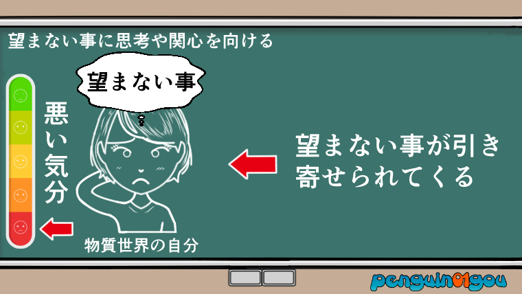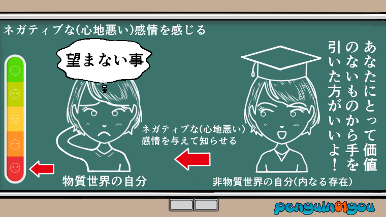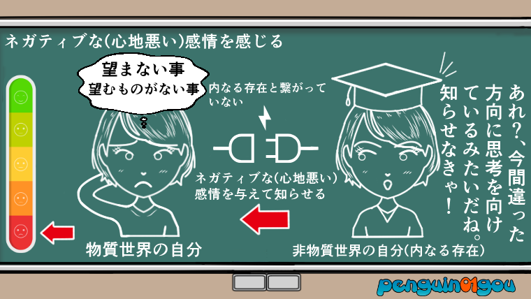 その逆に、もし僕たち自身が「望まないこと」や「望むものがない」という事に思考や関心を向けている場合は、「内なる存在」が心地悪い「ネガティブな感情」を僕たちに与えて、「今あなたは、間違った方向に思考や関心を向けているよ!」っと言う事を教えてくれます(下記イラスト参照↓)