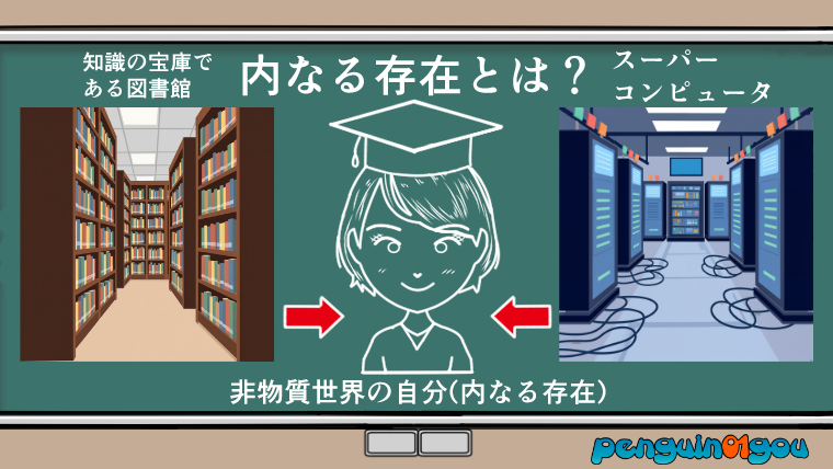 この「内なる存在」と言うのは、無限の知識、力、明晰さを持つ存在と言うことなので、例えるならば、知識の宝庫である巨大な図書館や超ハイテク性能を持つスーパーコンピュータのような、とっても賢い存在をイメージするといいかもしれません。(下記イラスト参照↓)