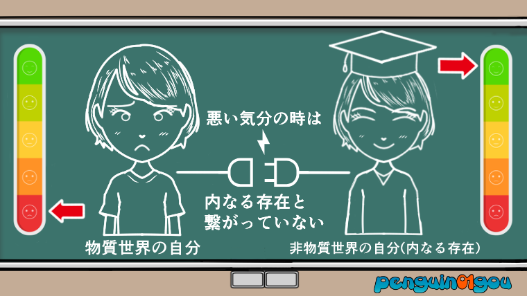 どのような時に『内なる存在』との繋がりを断ってしまうのかと言うと、それは物質世界の僕たちが、気分が悪くなるような事を考えていて、ネガティブな感情を感じている時だと言う事です。(下記イラスト参照↓)