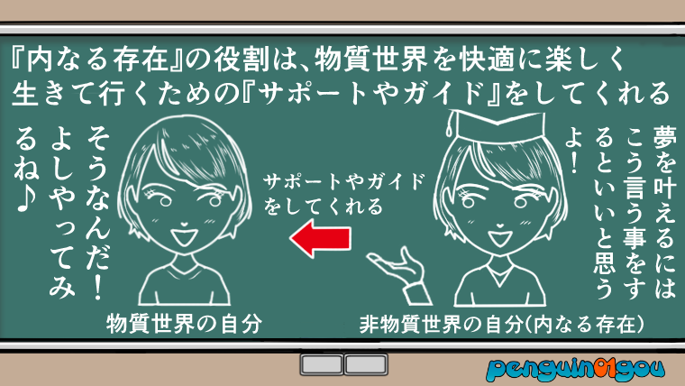 そして、この「内なる存在」の役割は何かと言うと、それは、僕たち人間がこの物質世界を快適に楽しく生きていくための、サポートやガイドなどをしてくれる存在だと言う事です。(下記イラスト参照↓)