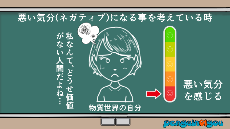 その逆に、もし物質世界に住む僕たち自身が自分の事を「私って価値がない人間だよね…」っと思っていたとします。(下記イラスト参照↓)