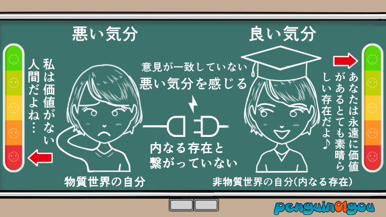 すると「内なる存在」は「あなたは永遠に価値があるとても素晴らしい存在だよ」っと常にそう思っているので、物質世界の自分自身の意見と非物質世界の「内なる存在」との意見が一致しないので、その一致していないと言う事を、「悪い気分」(ネガティブな感情)として感じることになります。